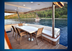 Mürettebat için ayrı yaşam alanları, tam donanımlı mutfağı, açık ve kapalı yemek yeme alanları ile misafirlerinin rahatlığını ön planda tutar. Göz alıcı güzellikteki Göcek koylarında, yeterli sayıdaki güneşlenme minderleri, sandalyeler ve servis takımları ile keyif dolu anlar yaşayabilirsiniz.
